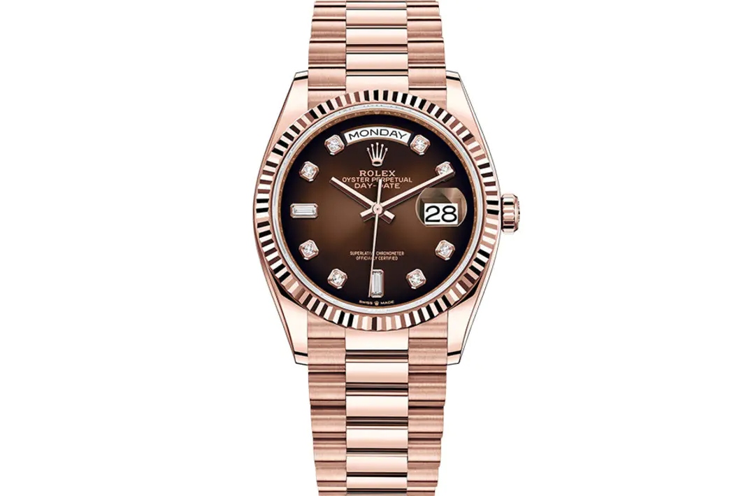 Chocolate dial with 8 diamonds and 2 baguette hour markers.