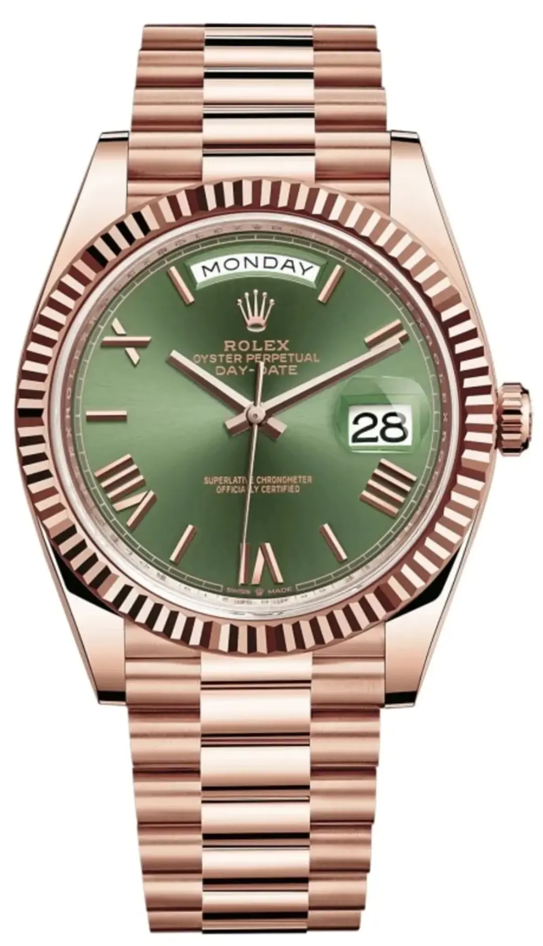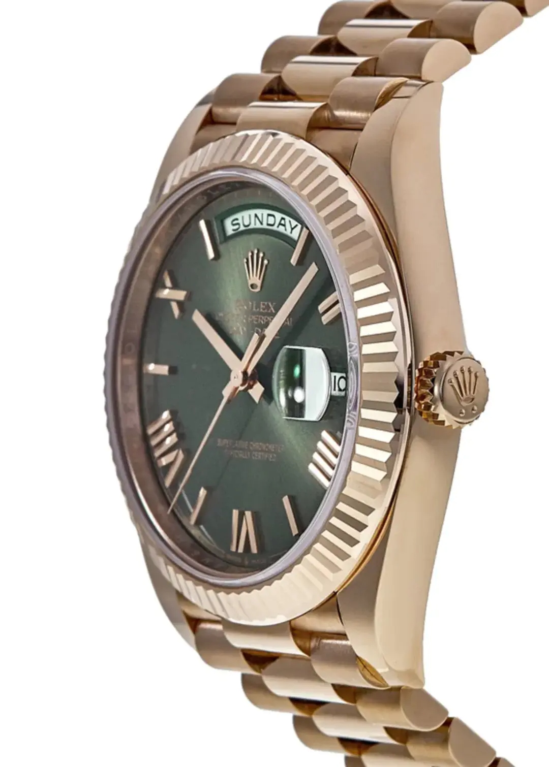 Rose Gold hands and Roman numeral/index hour markers with day of week at 12 o'clock and day of month at 3 o'clock on olive green