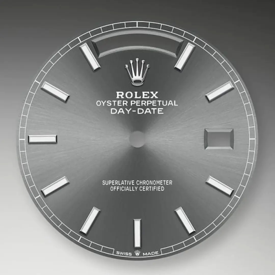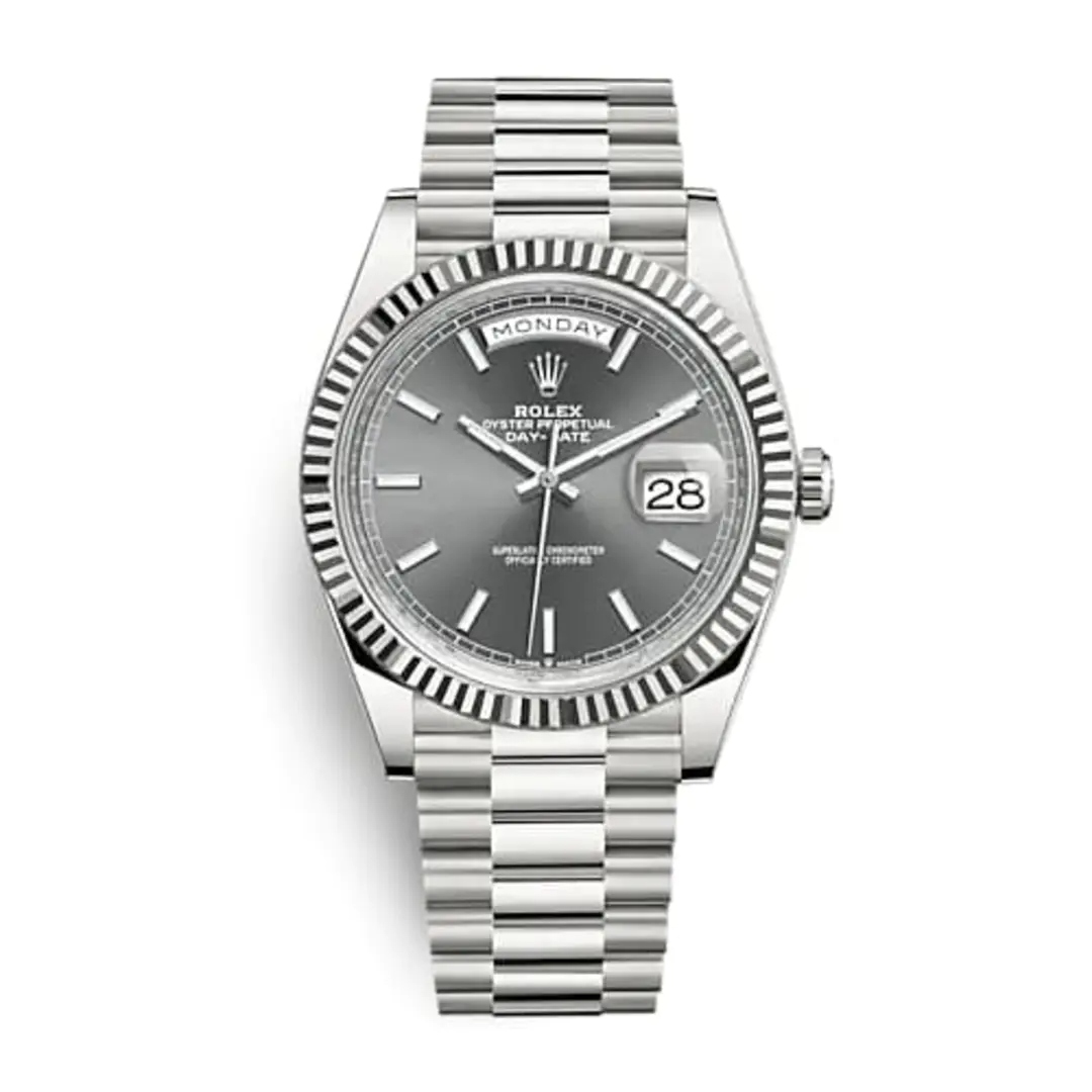 Unworn Rolex Day-Date 40mm, 18k White Gold watch. They have a Slate Dial, index hour markers fashioned from 18k gold. Highly legible Chromalight display with long-lasting blue luminescence. Monobloc middle case, solid screw-down case back, and winding crown. Scratch-resistant sapphire, Cyclops lens over the date. The date window is located at the 3 o'clock position. Day display located at the 12 o'clock position. The Fixed - Fluted 18k White Gold bezel. The movement is mechanical self-winding, caliber 3255 with 31 jewels and 70 hours of power reserve. The 18k White Gold President bracelet of semi-circular three-piece links with concealed folding Crownclasp. The water resistance is up to 100m/330ft. The Watch comes complete with store papers and a Rolex box. Will include 3 years Store Warranty.