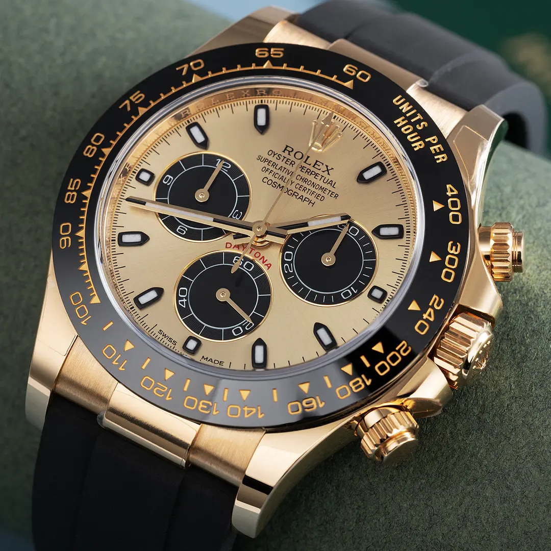 Rolex Daytona Cosmograph (116518LN) self - winding automatic watch, features a 40mm 18k yellow gold case with a black Cerachrom bezel surrounding a champagne dial on a black Oysterflex strap with a yellow gold deployant buckle.