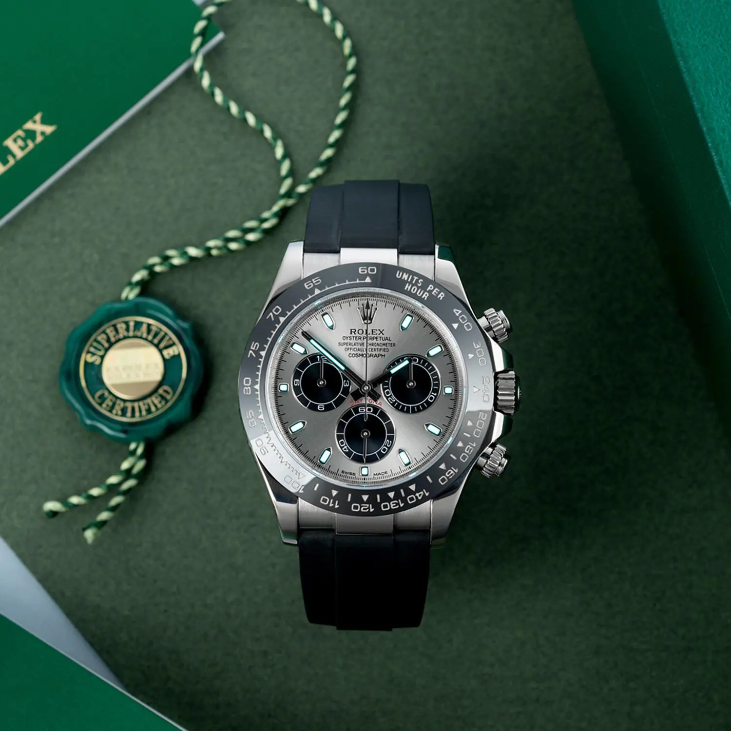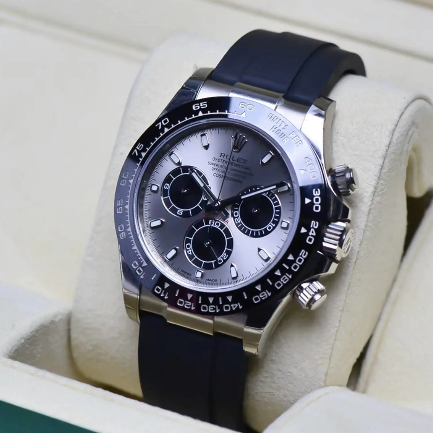 In perfect condition, this 116519LN is the most sought after, and hardest to get, of all gold Daytonas... The steely grey Panda dial and black scratch-proof ceramic bezel look superb with the 18ct white gold case and sporty waterproof rubber Oysterflex bracelet.