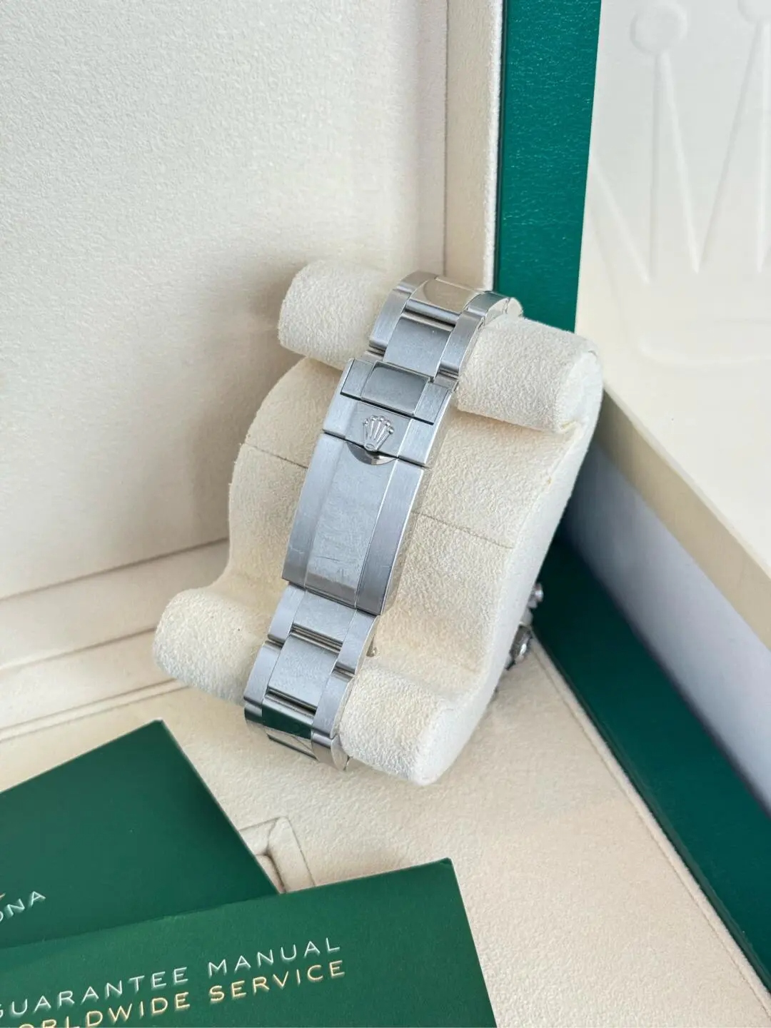 What truly sets the Rolex Daytona Cosmograph 116506 apart is its heart—the automatic caliber 4130 movement. This movement not only provides a remarkable power reserve of 60 hours but also ensures precision within -3/+3 sec/day, adhering to the stringent limits of COSC certification. Feel the robust energy of every tick as this watch keeps perfect time, no matter where life takes you. Moreover, the adjustable links ensure a tailor-fit for all wrist sizes, wrapping around your wrist in a secure embrace that feels both comforting and luxurious.