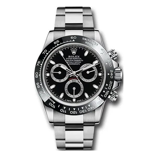 The Daytona 116500LN BK offers various useful functions, including the centre hour, minute, and seconds hands for everyday timekeeping. The chronograph function includes a centre hand that measures time accurately to within 1/8 of a second. The watch also features a 30-minute counter at 3 o’clock and a 12-hour counter at 9 o’clock. The stop seconds function allows precise time setting.