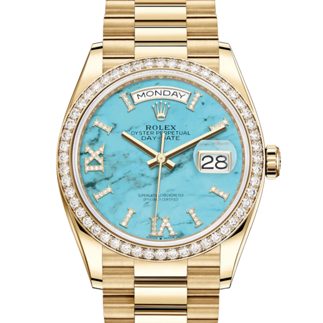 • Rolex Day-Date 128348RBR Yellow Gold Diamond Bezel Turquoise Diamond Dial