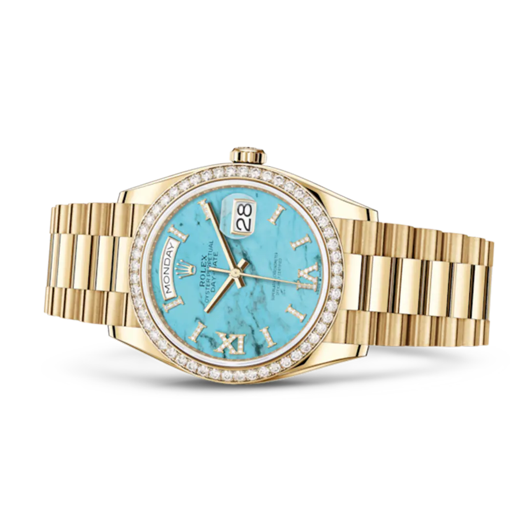 The Rolex Day-Date 128348RBR is the pinnacle of elegance and craftsmanship. This timepiece, crafted from 18k yellow gold, features a brilliant diamond-set bezel and a stunning turquoise dial adorned with diamond hour markers—a statement of sophistication and status.