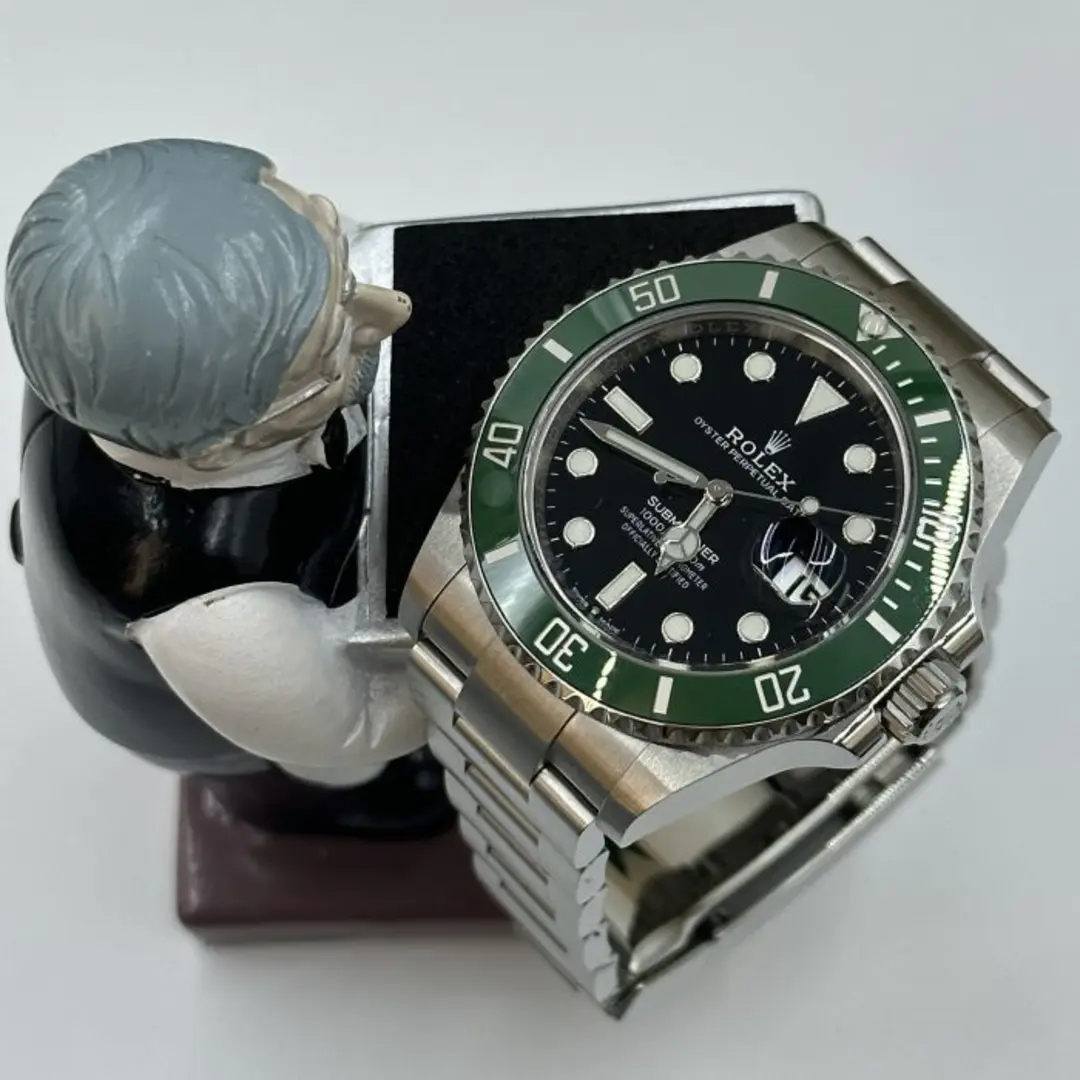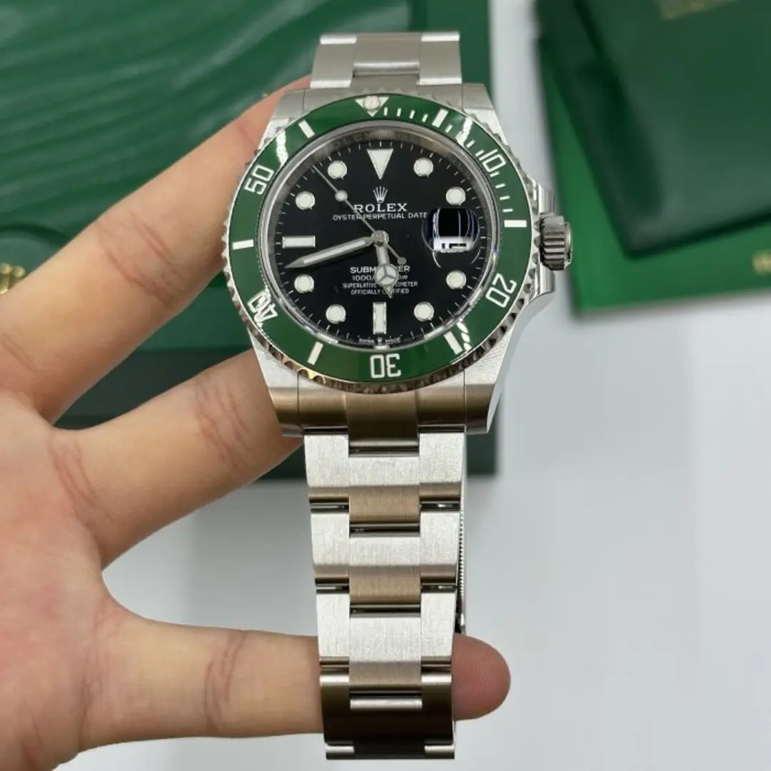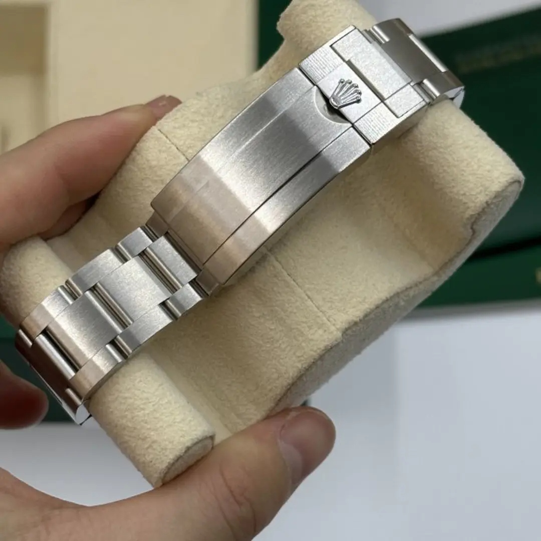 As you fasten the meticulously crafted 904L stainless steel bracelet around your wrist, you’ll appreciate the thoughtfully designed adjustable link and fold clasp, ensuring ultimate comfort and a perfect fit. The black dial, fondly nicknamed the Rolex Kermit, stands out with its bold yet refined stick and dot indices. The silver-tone, Mercedes-logo hands, and the sword and Breguet-style shapes enhance the watch’s aesthetics, ensuring it’s as striking as it is functional.
